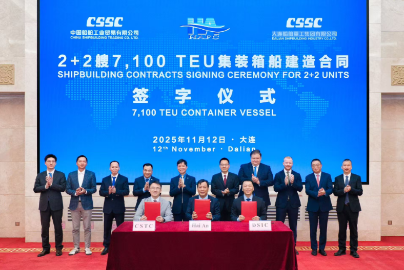 11月12日,中船大连造船联合中船贸易公司与越南海安绿色航运公司签署2+2艘7100TEU集装箱船订单。越南海安公司董事长Vu Thanh Hai、总经理Nguyen Ngoc Tuan,大连造船董事长韩东望、副总经理何旭参加仪式。