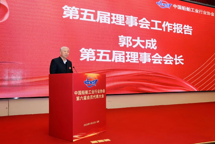 2025年11月23日,中国船舶工业行业协会第六届会员代表大会在北京隆重举行。大会全面总结了中国船协第五届理事会期间的工作,审议通过各项报告及议案,选举产生第六届理事会和第一届监事会。工业和信息化部装备工业二司司长徐春荣,第五届理事会会长郭大成、常务副会长吴强、常务副会长陈民俊,第六届理事会候选领导人,以及会员单位代表、有关省市船舶协会负责人和嘉宾等共三百余人出席会议。大会由第五届理事会常务副会长吴强主持。