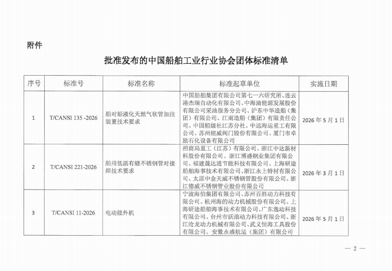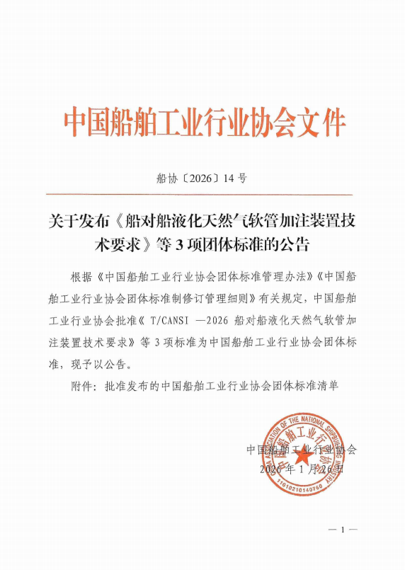 关于发布《船对船液化天然气软管加注装置技术要求》等3项团体标准的公告