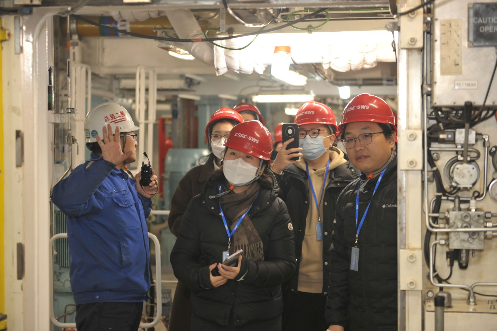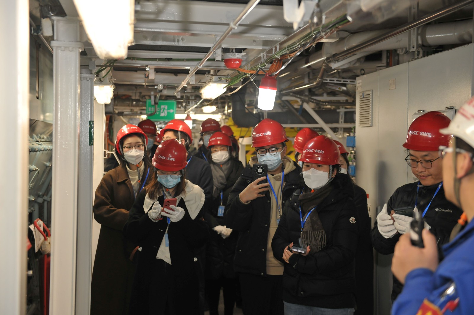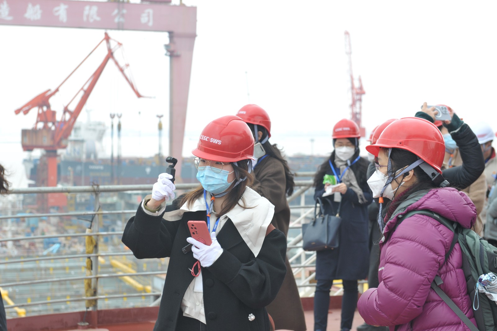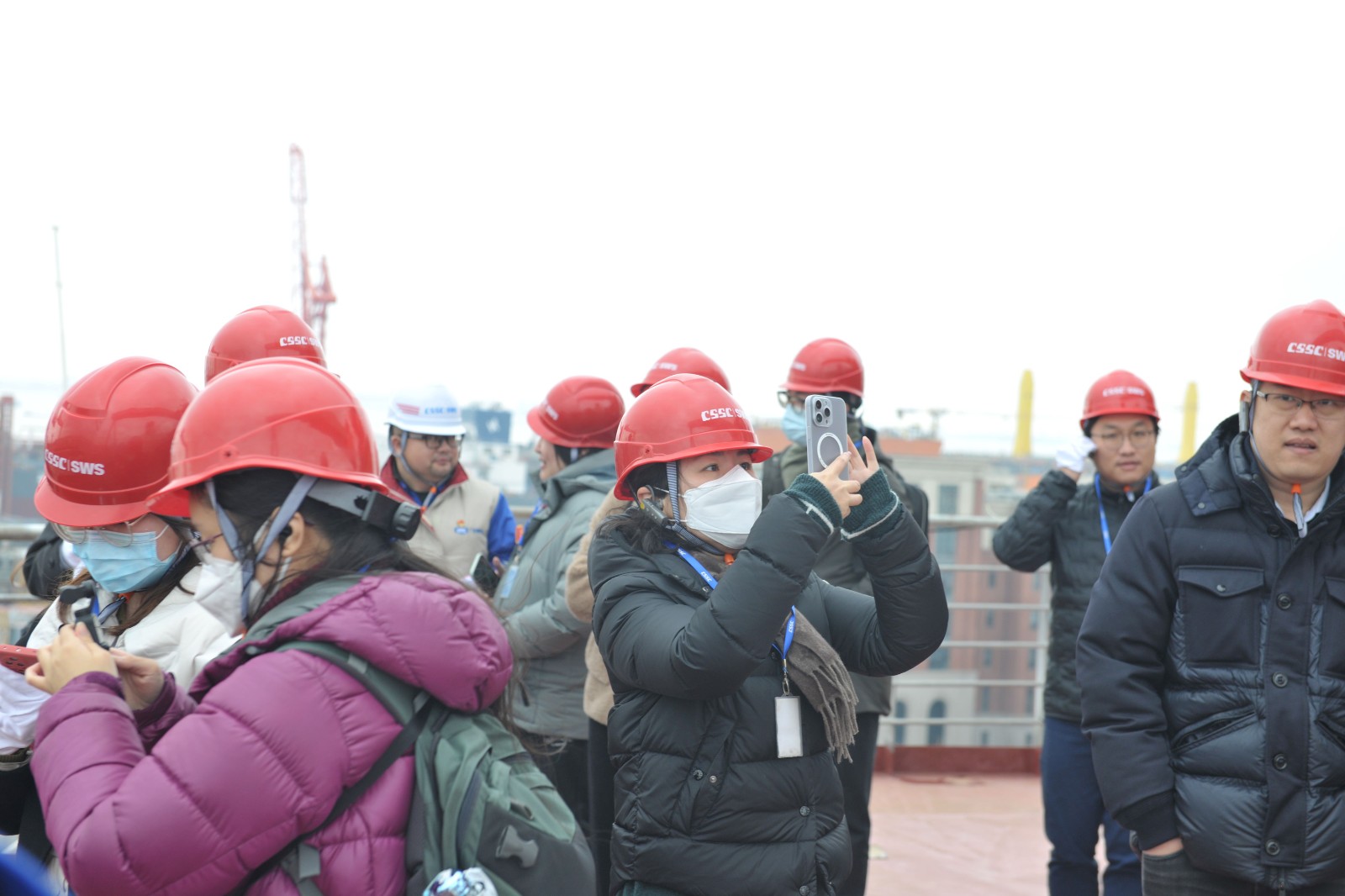 会后,媒体一行登上国产首制大型邮轮,现场听取了项目管理人员关于邮轮工程的进展介绍。