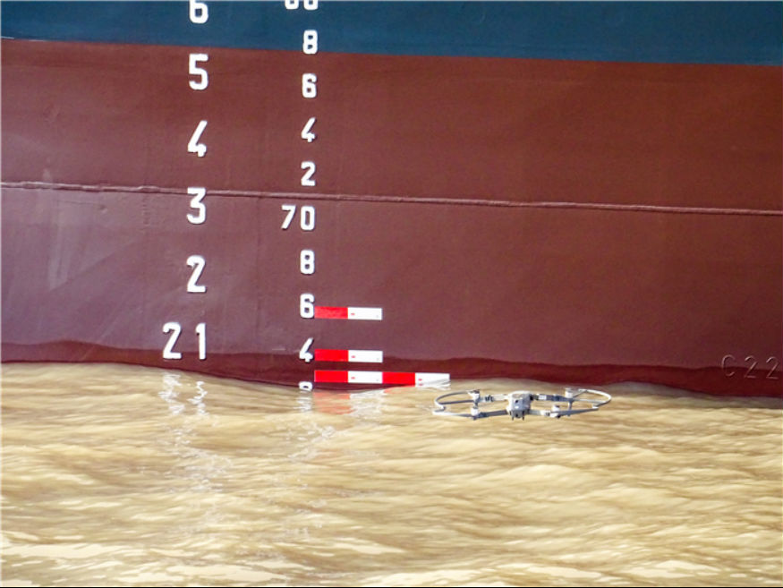 图示:2021年12月17日,麻豆社 利用无人机读取邮轮吃水数据。